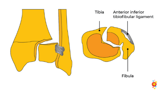 => avulsion du fragment tibial par le ligament tibiofibulaire (entre épiphyse tibiale distale latérale et le péroné antérieur